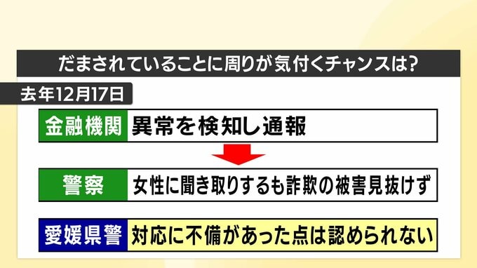 去年12月には、不審な金の流れを検知した金融機関が警察に通報。警察は詐欺を疑って本人に確認しましたが、被害を防ぐことはできませんでした。