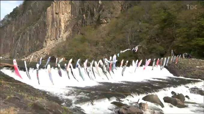 白石市の材木岩公園で行われたこいのぼりの取り付け作業には、地元の住民やボランティアなどおよそ30人が参加しました。参加した人たちは白石川の両岸から150メートルのワイヤー8本を通し、色とりどりのこいのぼり…