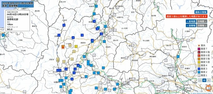 このほか、震度2から1の揺れを長野県内の広い範囲をはじめ、周辺の群馬県、新潟県、富山県、埼玉県、石川県、山梨県、岐阜県、静岡県、愛知県で観測しています。