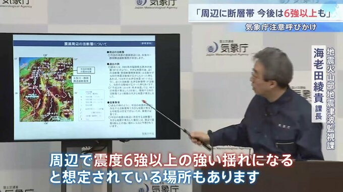気象庁の担当者は「周辺の活断層などで大きな地震が発生する可能性は否定できず、発生すれば震度6強以上の揺れが予想される」としています。