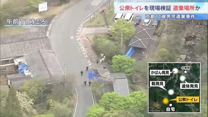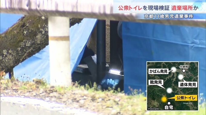 京都府南丹市で男子児童の遺体が見つかった事件で、警察は市内の公衆トイレで現場検証を行い遺体が遺棄された場所の可能性もあるとみて捜査しています。