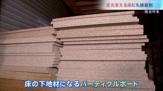 「床の下地材になるパーティクルボード。この上にフローリングやクッションフロアを貼っていく。接着剤がないと作れないもの」