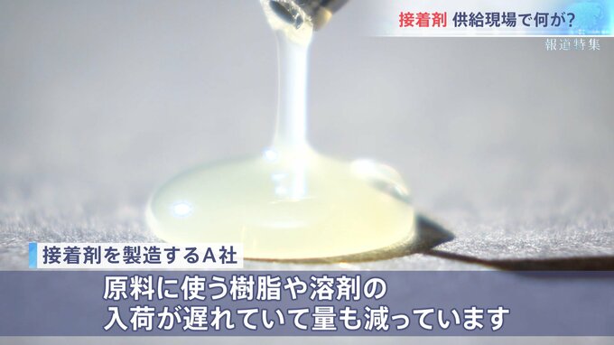 「原料に使う樹脂や溶剤の入荷が遅れていて、量も減っています。仕入れ先からは今後の出荷の見通しが立っていないと聞いていて、接着剤の製造に影響が出ています。原料の価格も上がっていて、このままでは会社の経営が厳しい」