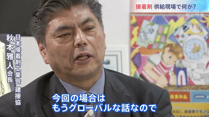 「接着剤の業界としては、そこまで溶剤形の接着剤に頼ってはいない部分もあるから、(製造や供給の)全体が冷え込むことは今はないが。(原料の)供給がどこまで続くのか、どこまで価格が上がるのかというのが、業界としても一番不安定なところ。3.11(東日本大震災)のときに、いろんな物質が止まって、あのときにまだ救いがあったのは、海外に頼めた。『韓国品やアメリカ品を引っ張ってこよう』ということができたが、今回の場合はグローバルな話なので」