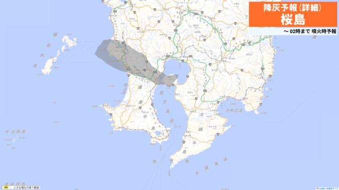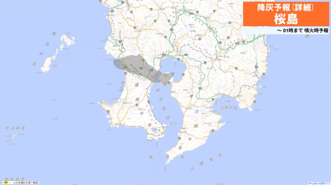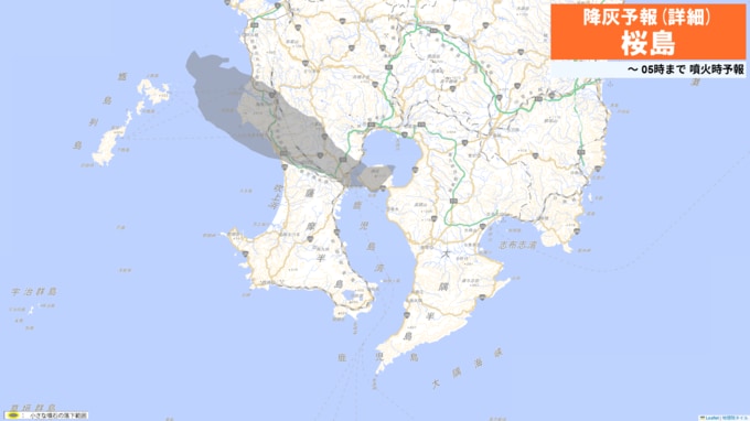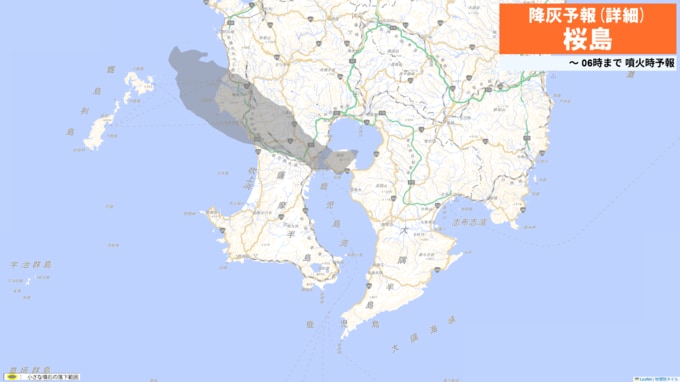 火口から北西方向(鹿児島市吉野方向)に火山灰が流され、19日午前6時までに鹿児島市、薩摩川内市、日置市、いちき串木野市、姶良市では少量の降灰があり、降灰は鹿児島県薩摩川内市まで予想されます。