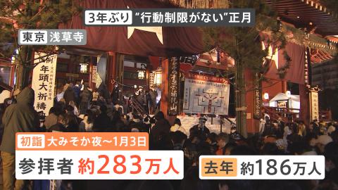 浅草寺では大晦日の夜から1月3日まで初詣に訪れた方は約283万人。2022年はといいますと、約186万人でしたので、約100万人増えたかなということになるわけです。