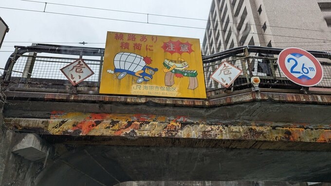 歴史を刻んだ橋脚に、味わい深いイラストの標識、そして「危い」のプレート。AIの描き出すレトロイメージとは異なる、時間の経過だけが表現できる錆びつきっぷりです。きっとこれまで、数えきれないほどの車が、屋根をぶつけてきたんでしょう。