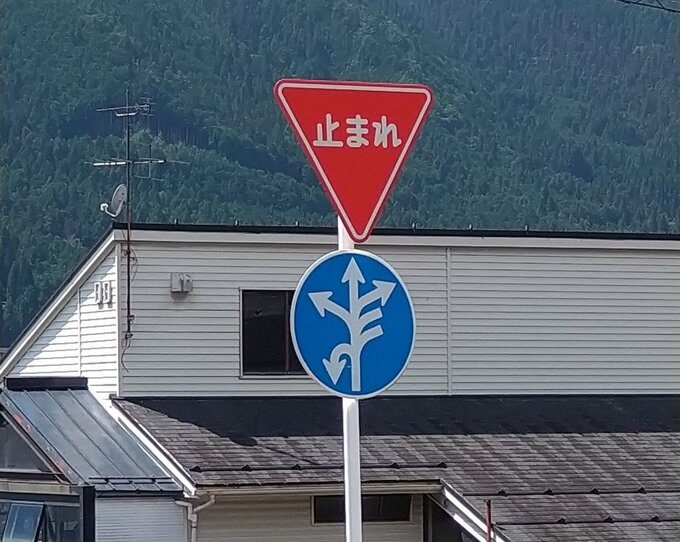 いかに進むべきか考え込んでしまうので、皆がきっちりと一時停止を遵守しそうな標識です。助手席に座っていたカメラマンが「昇竜拳みたいですね」と呟いたことを、今も鮮明に覚えています。いや、世代です。