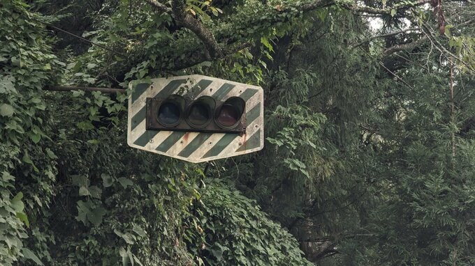これはオマケということになりますが、愛媛県内の山間部の廃校のグラウンドの片隅に、ひっそりと、かなり古そうな信号機が佇んでいました。とにかく小さな集落の学校なので、実物の信号機を校庭に設置して、交通安全教育に活用していたようです。