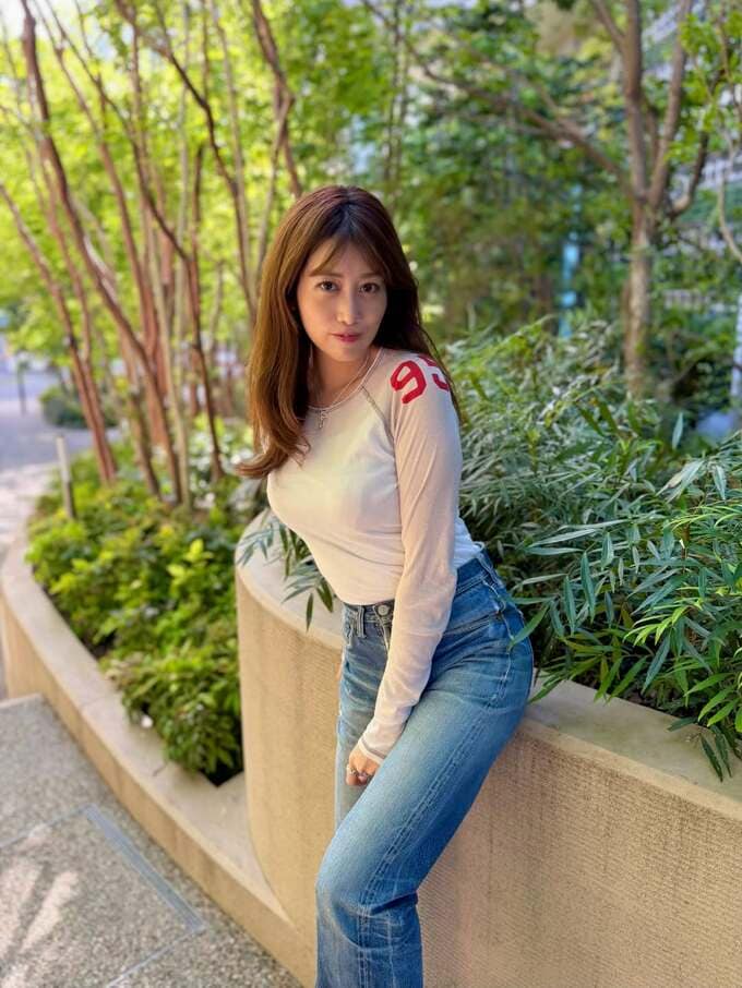 投稿された画像では、中川安奈さんが緑豊かな屋外で、クリーム色の長袖トップスに青いヴィンテージデニム、そして黒と白のVansスニーカーを合わせたコーディネートを見せています。トップスの肩元には赤い数字がプリントされており、さりげないアクセントが目を引きます。