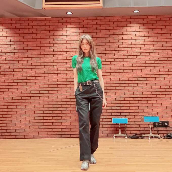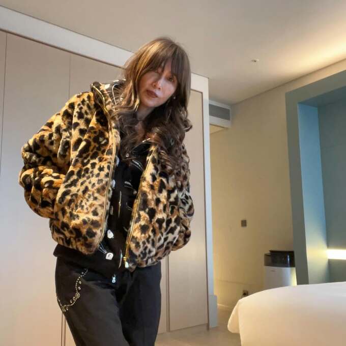 自身のコメントを裏付けるように、数多くのパンツスタイルが披露されているのも印象的です。緑のトップスに黒いパンツと黒いベルト・チェーンを組み合わせ、銀色の靴でアクセントをつけたスタイルや、レオパード柄のブルゾンに黒いトップスと黒いパンツのコーデなど、個性的でこなれた着こなしが目を引きます。