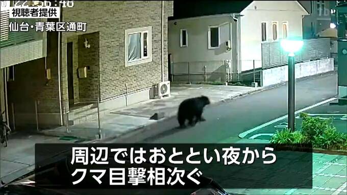警察や仙台市によりますと周辺では17日夜からクマの目撃情報が相次いでいて18日夜には、箱わなが設置された場所から近い仙台市青葉区通町のマンションの防犯カメラに住宅地を歩くクマの姿が映っていました。