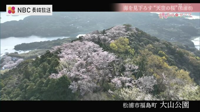 松浦市福島町・大山公園では、満開の桜が高台の斜面を薄紅色に染め上げています。