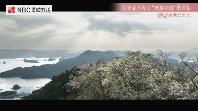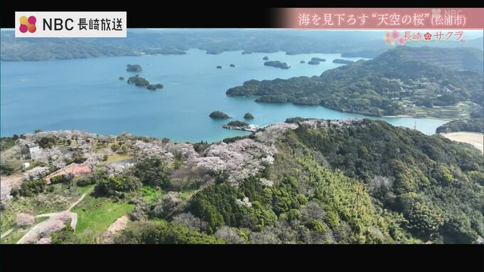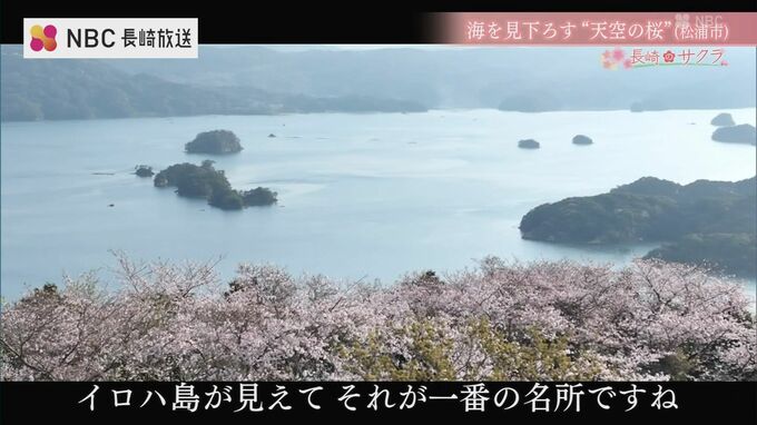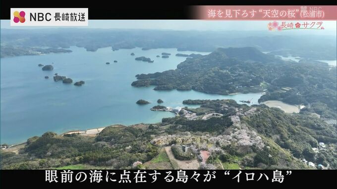 満開の桜の向こうには、大小の島々が点在する「イロハ島」と、岬状に連なる陸地が遠く霞んで見えます。
