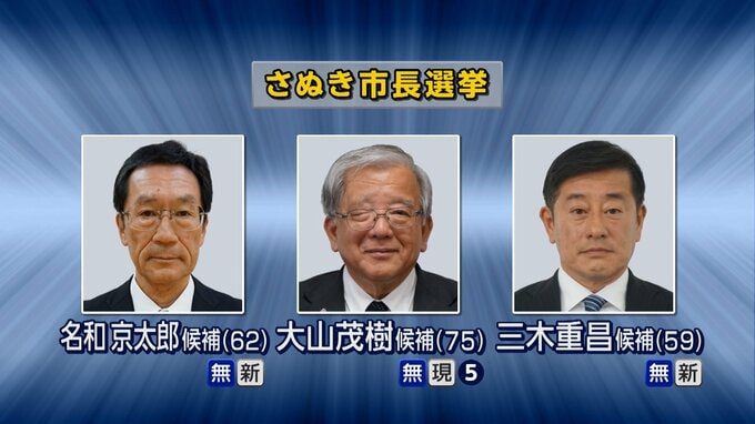 さぬき市長選挙に立候補したのは、届け出順に、いずれも無所属で、新人で市遺族連合会副会長の名和京太郎氏、現職で6回目の当選を目指す大山茂樹氏、新人で元会社員の三木重昌氏の3人です。