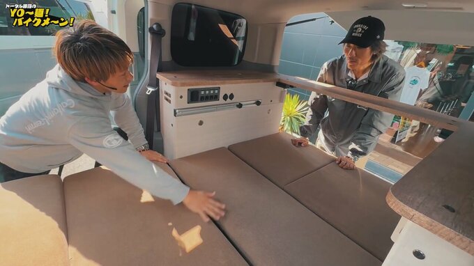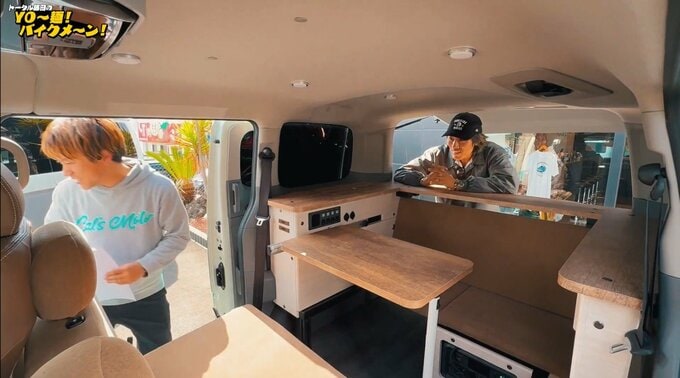 ソノバの真骨頂は、車内の「トランスフォーム」機能。テーブルとソファを配置したリビングモードから、座席を倒してフルフラットなベッドモードへと早変わりする様子に、藤田さんは「うわー!すげえ!」「これはすごい!」と大興奮。給排水タンクやポータブルバッテリー、カセットコンロまで備えた「セミキャンピングカー」仕様に、夢が膨らんでいるようでした。