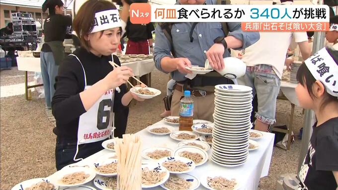 出石そばで知られる兵庫県豊岡市の出石地区では、春の名物イベント「出石そば喰い大会」が開催されました。 一斉にそばをかきこむ参加者たち。制限時間内に食べた皿の枚数を競い合います。 出石そばが名物の豊岡…