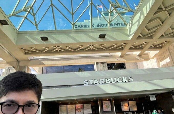 翌17日、予定より50分早く到着したハワイでは、迎えを待つ間スターバックスで待機。「早すぎて妻の迎えがまだなのでスタバで待機。でも、得した気分♪」とユーモアを交えて綴りました。