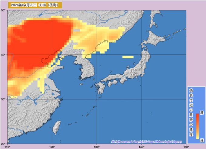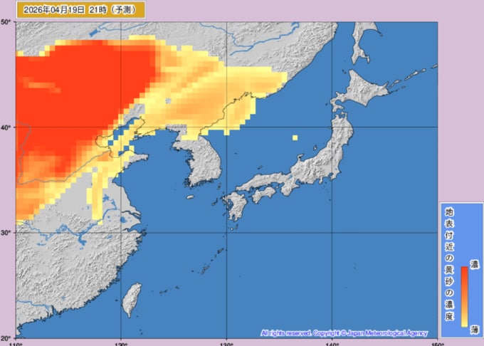 「地表付近の黄砂の濃度」を示した気象庁の黄砂解析予測図では、特に21日(火)午前から22日(水)夜にかけて、濃い黄砂が飛来する予測となっています。