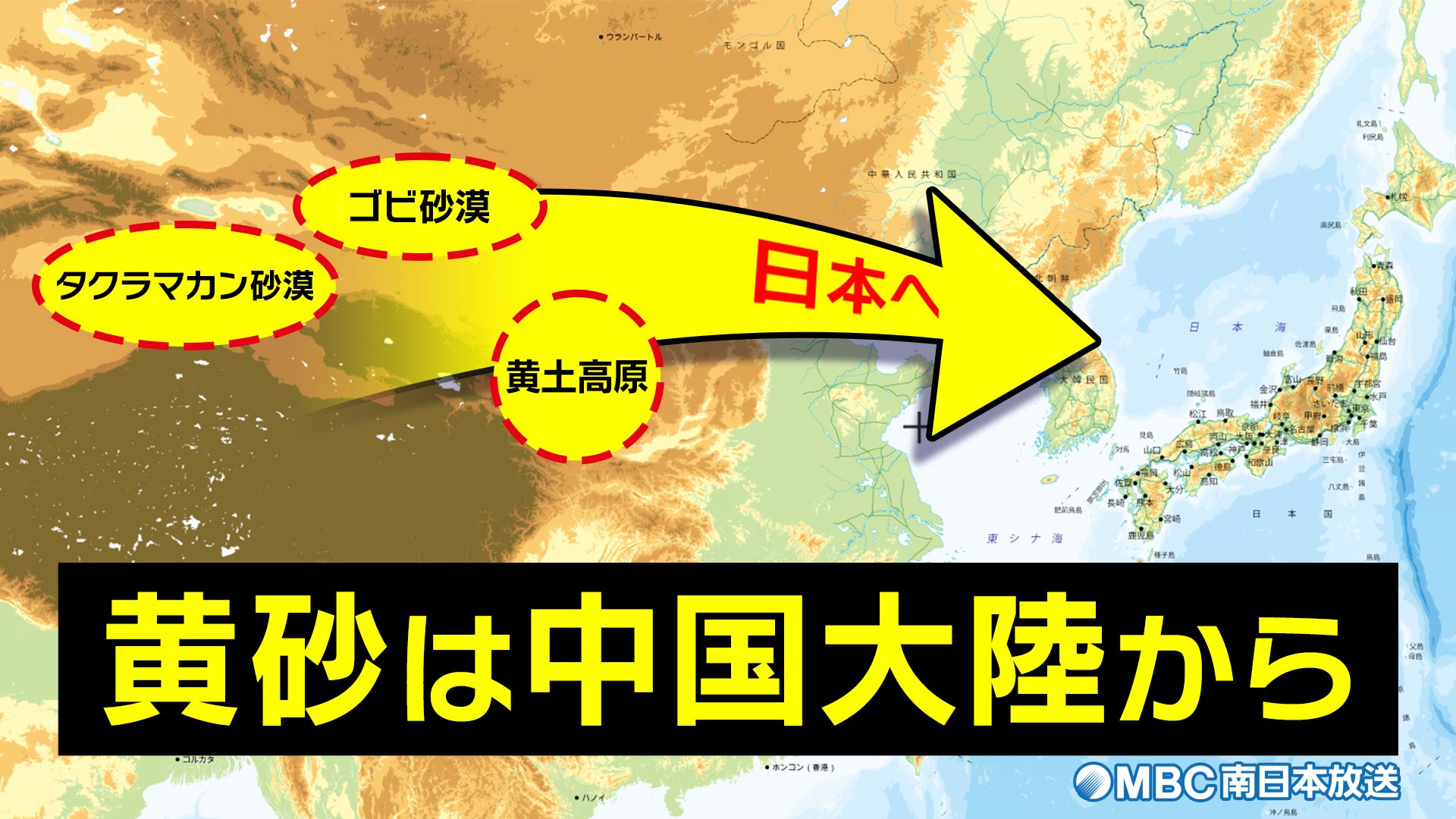 黄砂は東アジアの砂漠(ゴビ砂漠、タクラマカン砂漠など)や黄土地帯から強風により吹き上げられた多量の砂じん(砂やちり)が、上空の風によって運ばれ日本にやってきます。
