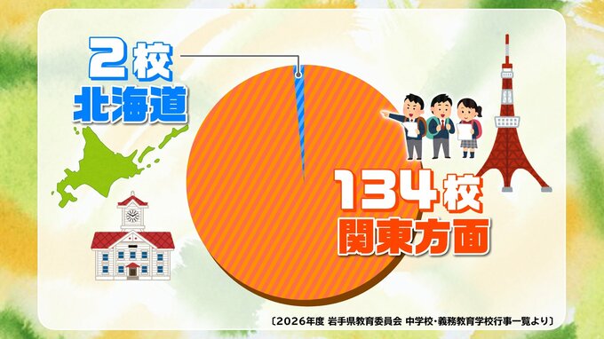 今どきの中学生は、修学旅行でどこに行っているの? 98.5%は〇〇方面へ 多彩な体験も 岩手 IBC岩手放送 2026年4月21日(火) 06:00 国内 行き先の結果は 県教育委員会によると、2026年度県内の中学校137校の修学旅行の行き先は、134校が関東方面。圧倒的な数字です。 残りの2校は北海道、そして残る1校は隔年開催のため2026年度は修学旅行を実施しないということです。