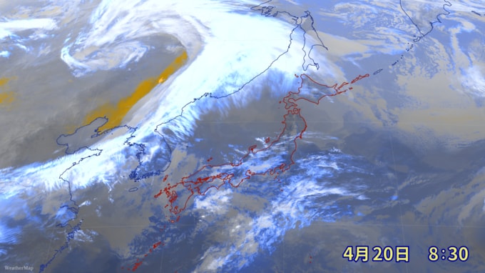 気象衛星ひまわりのデータから作成したカラー画像によりますと、20日(月)午前8時30分時点では、中国大陸に黄色のエリアがあり、黄砂を確認することができます。
