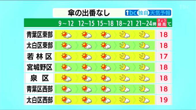 ■太白区東部:18℃ ■太白区西部:19℃ ■宮城野区:18℃