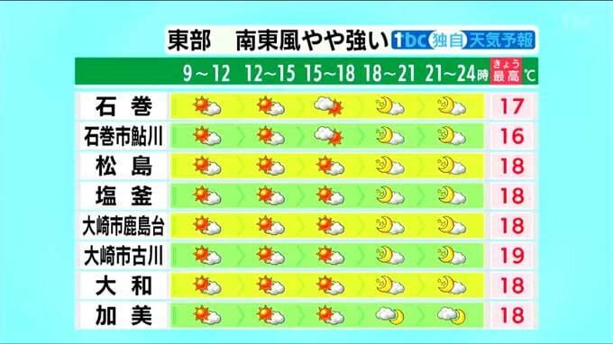 ■石巻:17℃ ■石巻市鮎川:16℃ ■松島:18℃