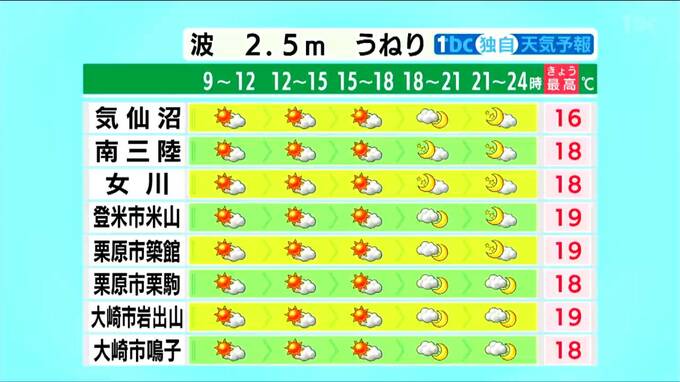 ■登米市米山:19℃ ■栗原市築館:19℃ ■栗原市栗駒:18℃