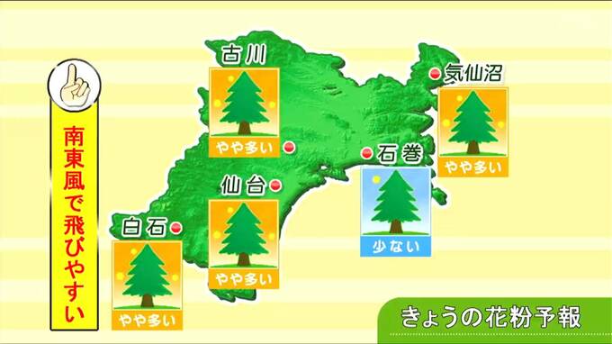 【20日宮城の天気】きのうより5℃前後低い涼しい一日に【雨雲シミュレーション・花粉・黄砂情報掲載】 21日は強風・黄砂に注意 tbc気象台 東北放送 2026年4月20日(月) 11:35 国内 天気 花粉情報 スギ花粉のピークはすでに完全に過ぎたとみられますが、今日は南東の風がやや強まるため、やや多く飛ぶところが多くなりそうです。引き続きご注意ください。