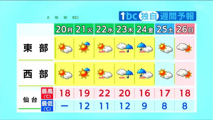 【20日宮城の天気】きのうより5℃前後低い涼しい一日に【雨雲シミュレーション・花粉・黄砂情報掲載】 21日は強風・黄砂に注意 tbc気象台 東北放送 2026年4月20日(月) 11:35 国内 天気 週間予報 天気は短い周期で変わる見通しです。木曜日の午後から金曜日の午前にかけては、低気圧の影響でまとまった雨となりそうです。気温は木曜日まで平年より高い状態が続きますが、金曜日以降はほぼ平年並みに落ち着くでしょう。