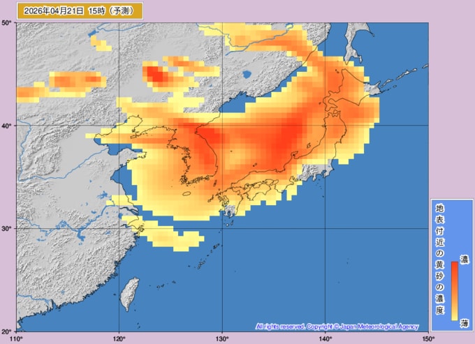 今後の黄砂のシミュレーションを見ると、あす21日朝には西日本で黄砂が飛来しそうで、その後は日本全国で黄砂が飛来する見込みです。