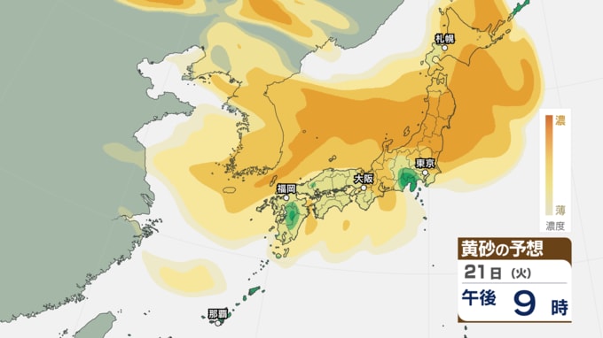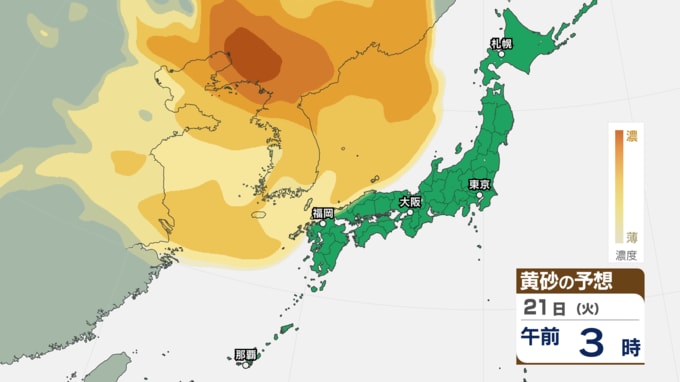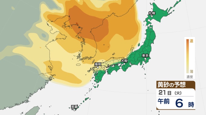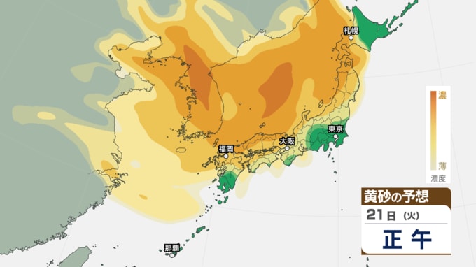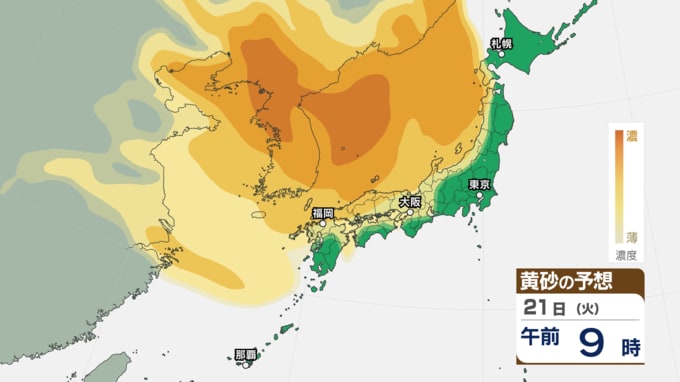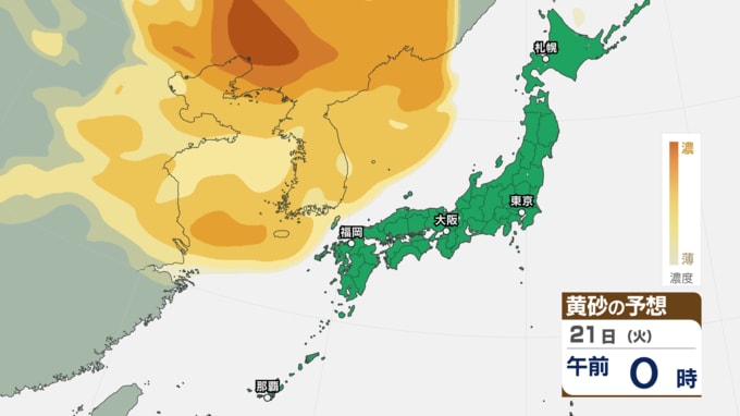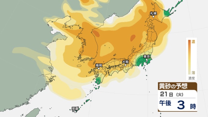 【 黄砂注意 】あす21日~22日は全国的に黄砂飛来へ アレルギーや呼吸器系疾患の人は注意を【黄砂情報・黄砂シミュレーション・20日午前11時40分時現在】 新潟放送 2026年4月20日(月) 11:44 国内 天気 21日(火)の黄砂シミュレーション