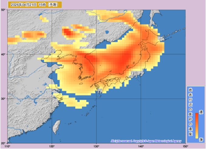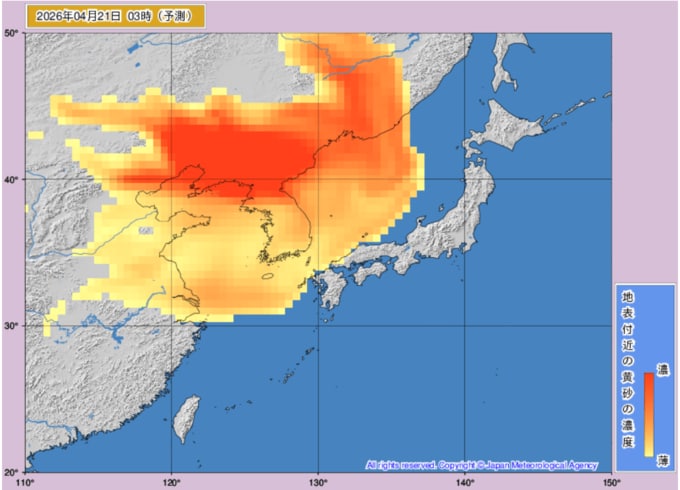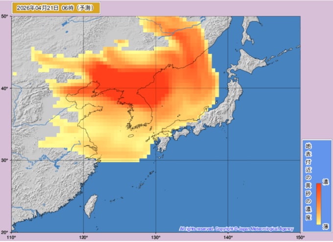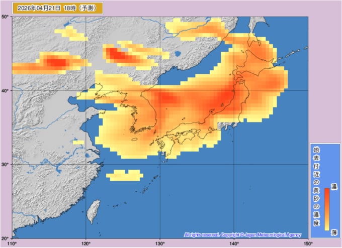 【黄砂情報】日本列島の広範囲に黄砂飛来か...20日~23日の黄砂シミュレーション いつどこに、どれくらい飛んでくる? 黄砂を上空から見たデータで確認 気象庁発表 全国の天気を画像で テレビユー山形 2026年4月20日(月) 10:35 国内 ■黄砂はいつ・どこに(21日)