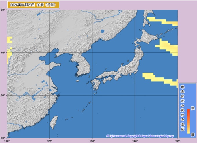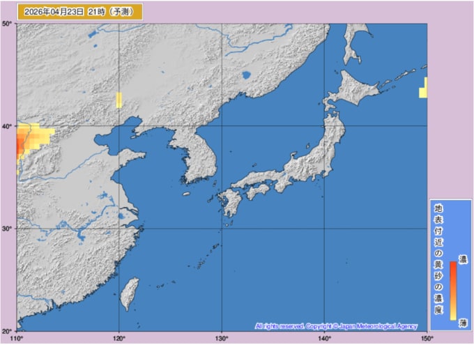 【黄砂情報】日本列島の広範囲に黄砂飛来か...20日~23日の黄砂シミュレーション いつどこに、どれくらい飛んでくる? 黄砂を上空から見たデータで確認 気象庁発表 全国の天気を画像で テレビユー山形 2026年4月20日(月) 10:35 国内 ■黄砂はいつ・どこに(23日) ※画像は気象庁より