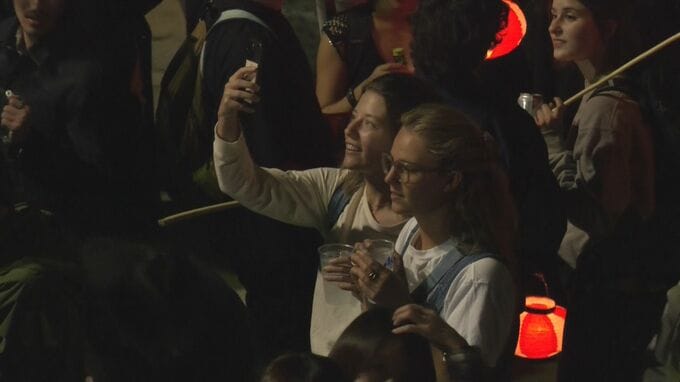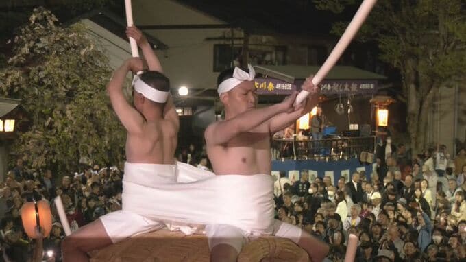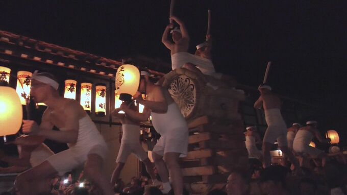 19日夜8時半ごろ、町中心部の広場では、大太鼓にまたがったさらし姿の男たちが威勢よくバチを振り下ろし、太鼓を打ち鳴らしながら町を練り歩きました。