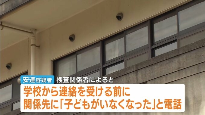 学校が午前11時45分ごろに母親に電話連絡したことで行方不明になっていることが分かりましたが、捜査関係者によりますと、安達容疑者は学校から連絡を受ける前に、関係先に「子どもがいなくなった」と電話していたということです。