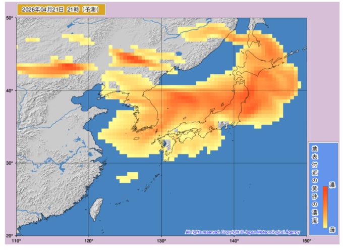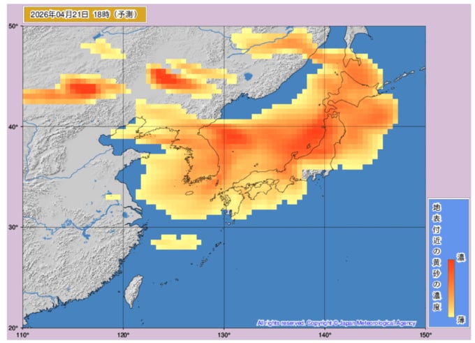 【黄砂情報】21日から「日本列島」に飛来予想 広い範囲で影響【20日(月)~22日(水)黄砂シミュレーション】気象庁の黄砂解析予想図「黄砂に関する全般気象情報」