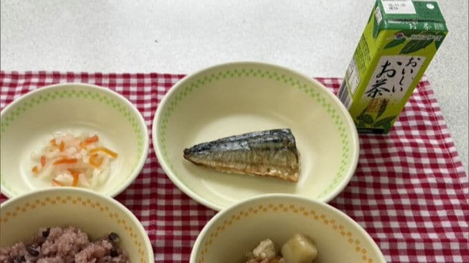 2025年度までは、すべての献立で牛乳が提供されていましたが4月は、赤飯やサバの塩焼きなどにあわせてパックの緑茶が出されました。