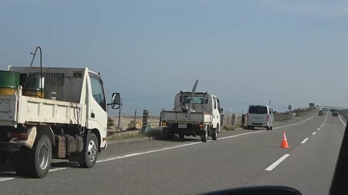 その後、事故を目撃し停車した別のトラックに後ろから来た乗用車が追突し、その反動でこのトラックが走行車線にはみ出し、さらに別の乗用車と接触しました。