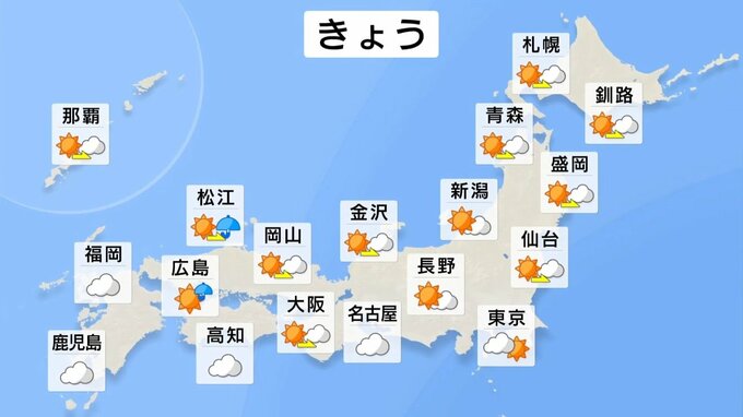 きょうは、西日本の南にある低気圧の影響で、東海から九州の太平洋側を中心に雨が降る所があるでしょう。一方、関東から北日本では、日差しの届く所が多くなりそうです。