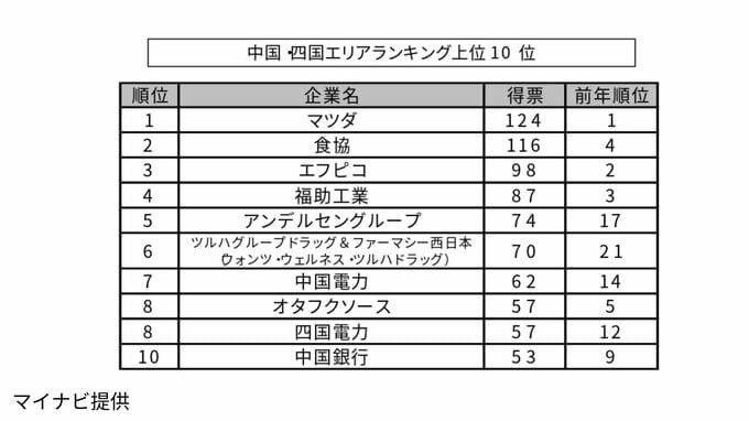 調査結果によりますと、「マツダ」が得票数124票で7年連続の首位を獲得。2位には米卸売業の「食協」(116票)が前年の4位からランクアップし、3位は「エフピコ」(98票)、4位は「福助工業」(87票)と続きました。