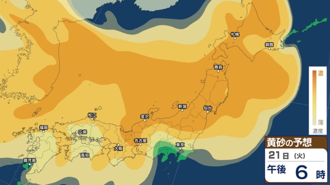 気象庁の発表する「黄砂解析予測図」や、最新の「黄砂の予想シミュレーション」を見てみると、今週21日~23日にかけては、大陸方面から流れてくる“黄砂の影”がほぼ日本全国を覆うことが予想されています。