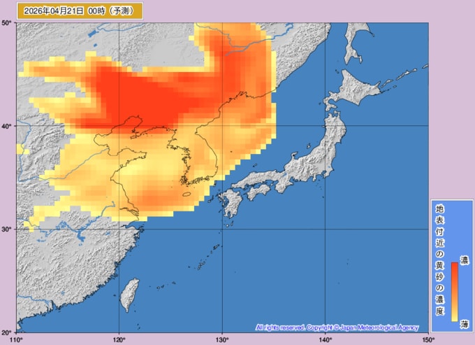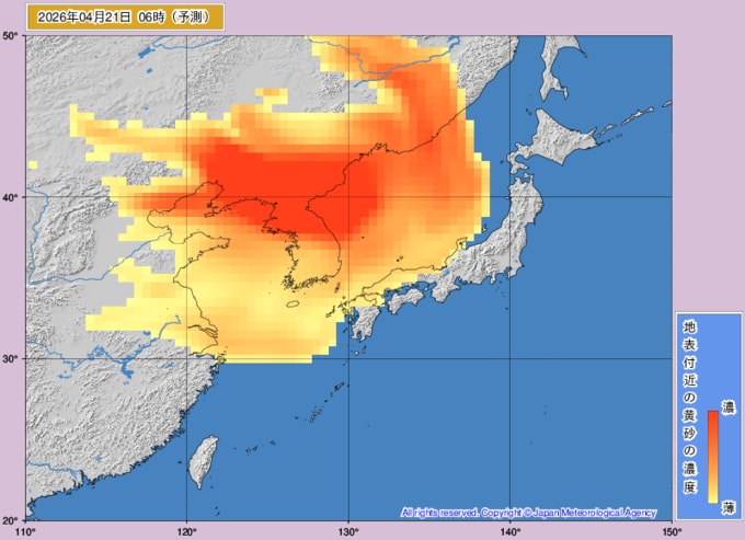 【黄砂情報】21日~23日にかけてほぼ全国に黄砂飛来か… 日本覆う“黄色い影” 高濃度の黄砂の飛来が予想される所も 濃度や飛来する時間帯は?【最新予想シミュレーション・気象庁の黄砂解析予測図あり】 青森テレビ 2026年4月20日(月) 15:00 国内 【4月21日(火)午前】気象庁の黄砂情報「黄砂解析予測図」 ※画像は気象庁HPより ♦黄砂解析予測図 ♦黄砂の予想シミュレーション (4月20日・21日・22日・23日) ♦記事を最初から読む