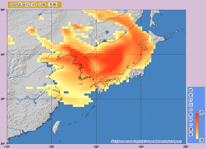 【黄砂情報】21日~23日にかけてほぼ全国に黄砂飛来か… 日本覆う“黄色い影” 高濃度の黄砂の飛来が予想される所も 濃度や飛来する時間帯は?【最新予想シミュレーション・気象庁の黄砂解析予測図あり】 青森テレビ 2026年4月20日(月) 15:00 国内 【4月21日(火)午後】気象庁の黄砂情報「黄砂解析予測図」 ※画像は気象庁HPより ♦黄砂解析予測図 ♦黄砂の予想シミュレーション (4月20日・21日・22日・23日) ♦記事を最初から読む