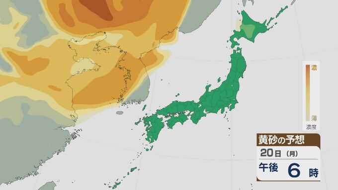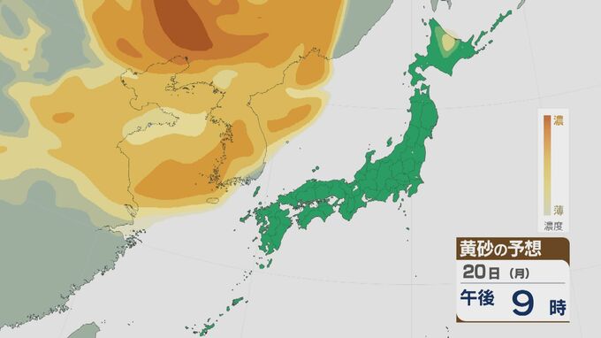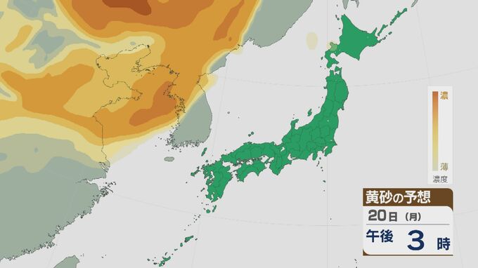 【黄砂情報】大陸からの黄砂 21日(火)には九州から北海道まで広範囲に飛来 日本海側では濃度が高く注意を 飛来予想シミュレーション 北陸放送 2026年4月20日(月) 14:13 国内 大陸からの黄砂は、21日(火)以降九州から北海道まで広い範囲で飛ぶ見込みです。21日は日本海側で濃度が高いおそれがあり、注意が必要です。 黄砂の予想です。20日(月)は大陸や朝鮮半島にある黄砂が次第に日本列島にやってくる見込みです。