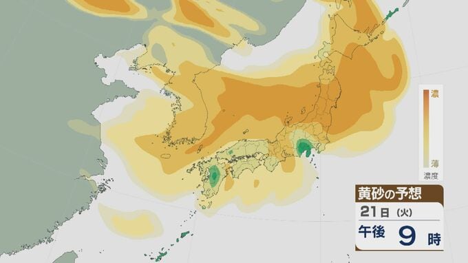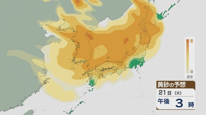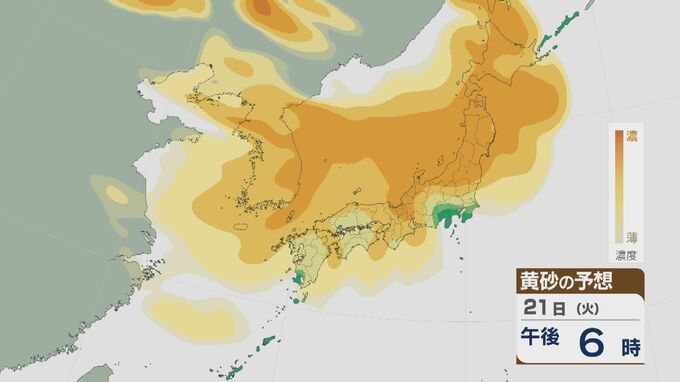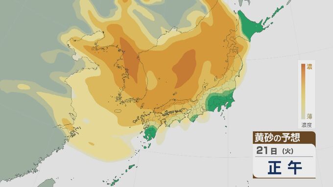 【黄砂情報】大陸からの黄砂 21日(火)には九州から北海道まで広範囲に飛来 日本海側では濃度が高く注意を 飛来予想シミュレーション 北陸放送 2026年4月20日(月) 14:13 国内 21日の昼過ぎからは、九州から北海道まで広範囲で黄砂が飛ぶ見込みです。北陸や東北の日本海側では濃度の高いところがありそうです。