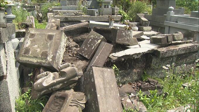 「こちらのお墓は10年前の地震の影響で、今でも壊れたままの状態となっています。墓石が横に転がっています」