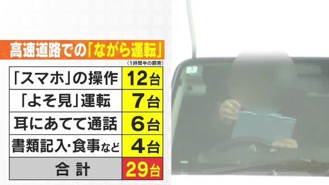 今回、1時間半確認しただけで、「スマホの操作」が12台、スマホの画面を見るなど「よそ見」が7台、「耳に当てての通話」が6台、そのほか書類記入や食事など、「ながら運転」をしていたのは、あわせて29台にのぼりました。