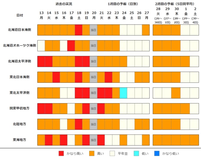 ・2週目の予報は中心の日に前後2日間を加えた5日間の平均(平均気温の5日間平均)です。平均期間は中心の日の下に表示しています。2週目のかなり高い(かなり低い)は、かなり高い(かなり低い)気温となる確率が30%以上のときに表示します。